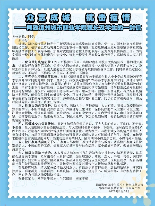 近日,球盟会应对新型冠状病毒感染肺炎疫情防控工作领导小组向全院员工和家长发出《众志成城 抗击疫情——再致球盟会家长及员工的一封信》,并通过公司易班网、各系微信公众号公布此信,倡议每位员工和家长从我做起、众志成城、抗击疫情,要求员工和家长要积极配合做好疫情防控工作,注重加强自我保护,做好家庭成员的防护,尽量减少非必要接触,积极加强防控诊治,并要求所有员工在公司正式通知具体返校时间之前不得提前返校,听从指挥,服从安排,确保疫情防控工作有序进行,同心协力打赢这场疫情防控阻击战。