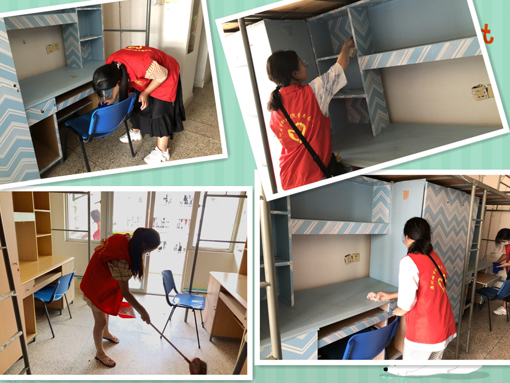 志愿者们带着清洁工具来到新生宿舍,有条不紊地进行着打扫工作。大家不怕脏不嫌累,通力协作,从擦拭桌椅、衣柜、到清洁地面等,不留下任何一个死角。他们积极投入到宿舍清洁工作中,热火朝天地忙碌着。