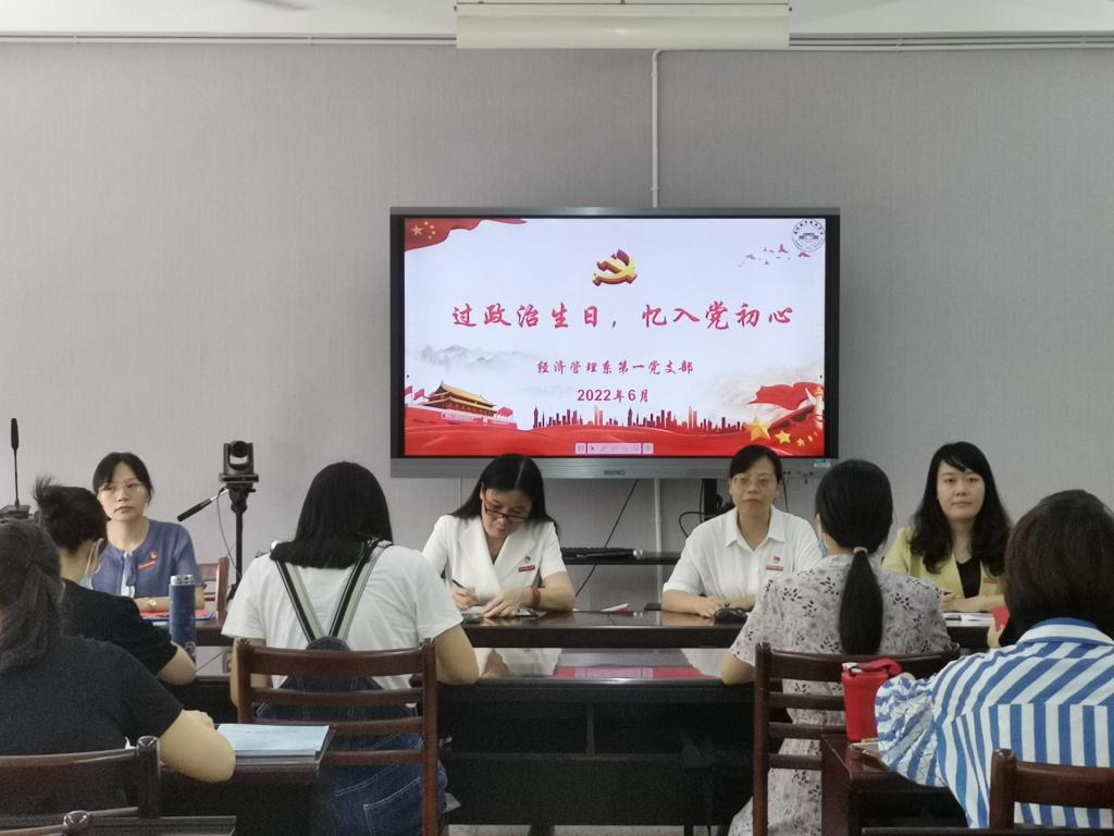 2022年6月29日上午,球盟会经济管理系第一党支部在系会议室开展“过‘政治生日’忆入党初心”主题党日活动,为入党日期在第二季度的10名党员同志集体过“政治生日”。